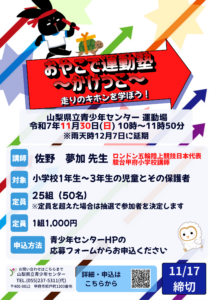 主催事業「おやこで運動塾~かけっこ(冬)~」を開催します イベント 親子 2025.10.22 11月30日(日)に主催事業「親子で運動塾~かけっこ(冬)」を開催します。 オリンピック五輪陸上競技日本代表として出場し、 現在は駿台甲府小学校で講師をしている佐野夢加先生がやさしくかけっこの基礎を教えに来てくれます。 ■日時 11月30日(日)※雨天時は12月7日に延期となります。 9:30受付開始 10:00開始 11:50終了予定 ・要項はこちら ・チラシはこちら ・応募はこちら 皆様のご応募をお待ちしております。